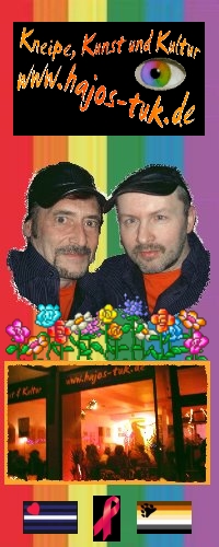 Unter dem Motto Kneipe, Kunst und Kultur wollen wir auch 2008 in der s/l/t Schöneberger Szene von Berlin mehr bieten: Nämlich eine anspruchsvolle, interessante und abwechslungsreiche Mischung. HaJo's TuK steht dabei ganz einfach für Ha(ralds und) Jo(jo)s T(reff) u(nd) K(ultur) und ist in der Martin-Luther-Straße 21 (Ecke Motzstraße). Ihr könnt zu unseren Öffnungszeiten mit uns direkt über diese Homepage chatten! Ganz aktuell: Stammtischessen!